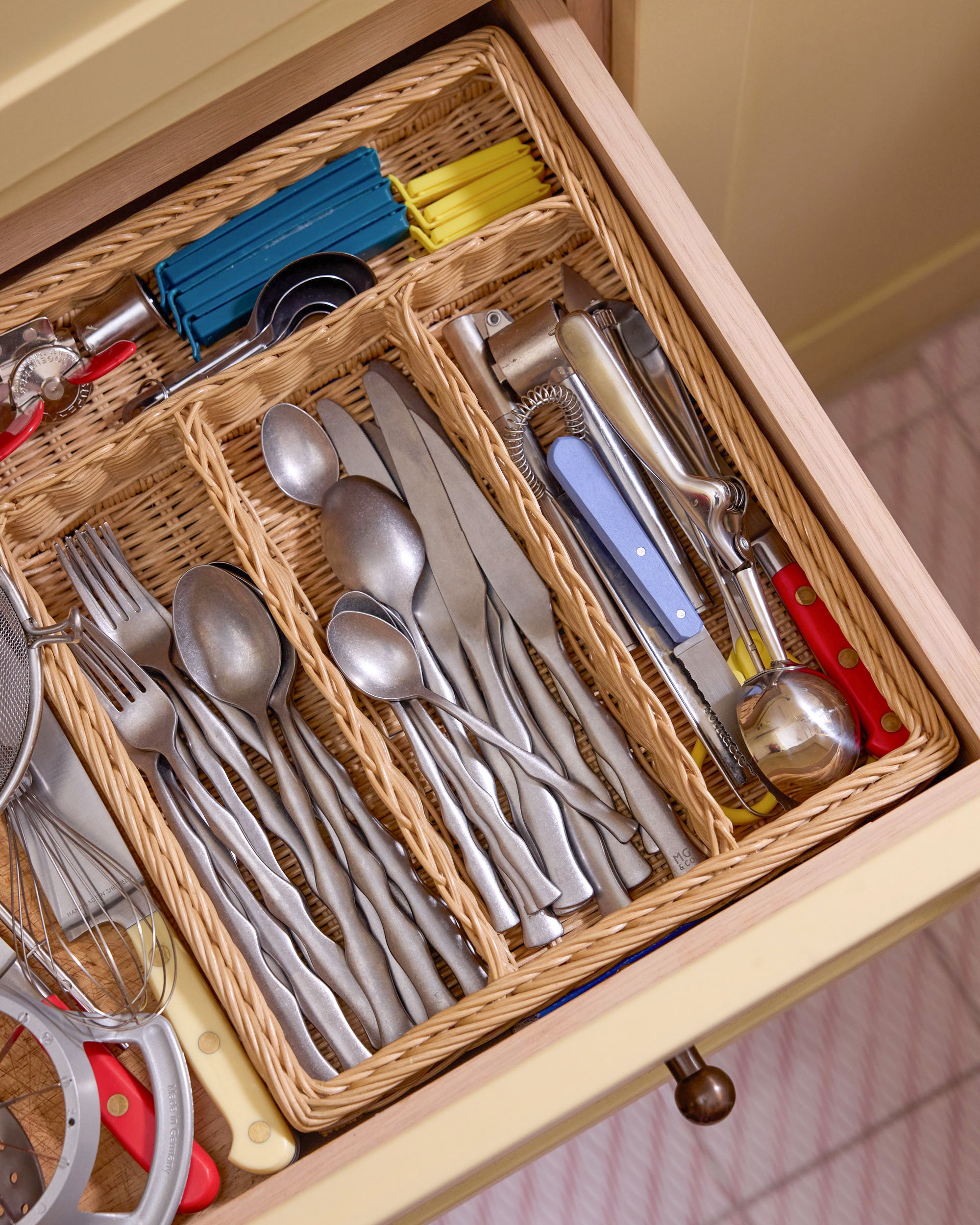 Avoid cluttered cupboards by creating handy compartments. Start with your drawers and sort by size and family: cutlery and smaller pieces can fit happily into a smart cutlery tray. For messy countertops, consider using baskets or old jam jars for spices and a sink caddy for washing up liquid and brushes.